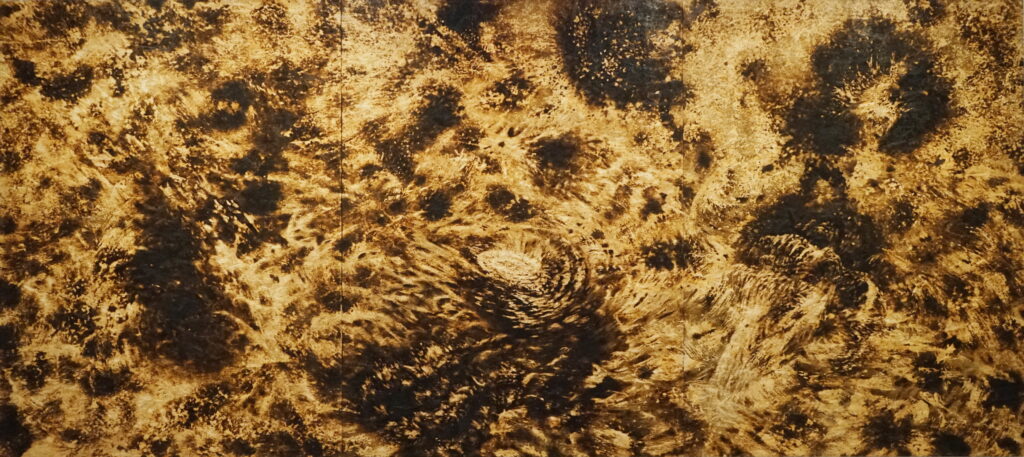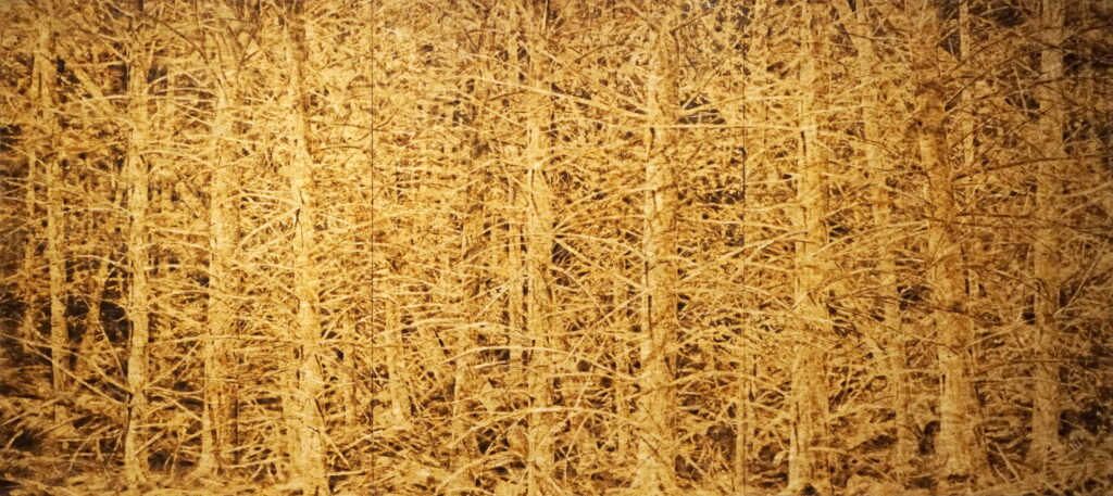 o. T., 2025, Schleifpapier und Stechbeitel auf gebrannter Grobspanplatte, 278 x 621 cm (Triptychon) | untitled, 2025, sandpaper and wood chisel on burned OSB, 278 x 621 cm (triptych)